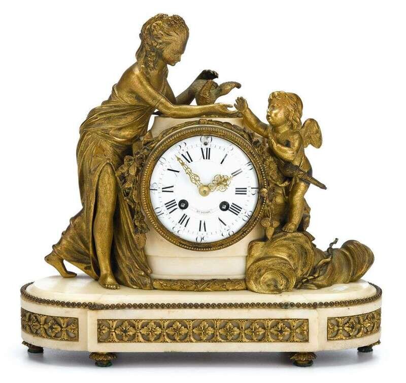 The circular white enameled dial with Roman and Arabic numerals, surmounted by a gilt bronze dove and flanked by figures of Cupid and Venus, raised on a shaped oval base above toupie feet.