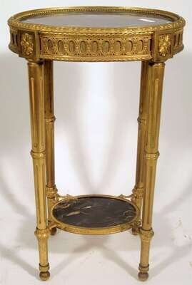 The oval black marble inset top over floral and guilloche carved frieze, above fluted tapering legs surmounted by paterae and united by conforming marble inset undertier.