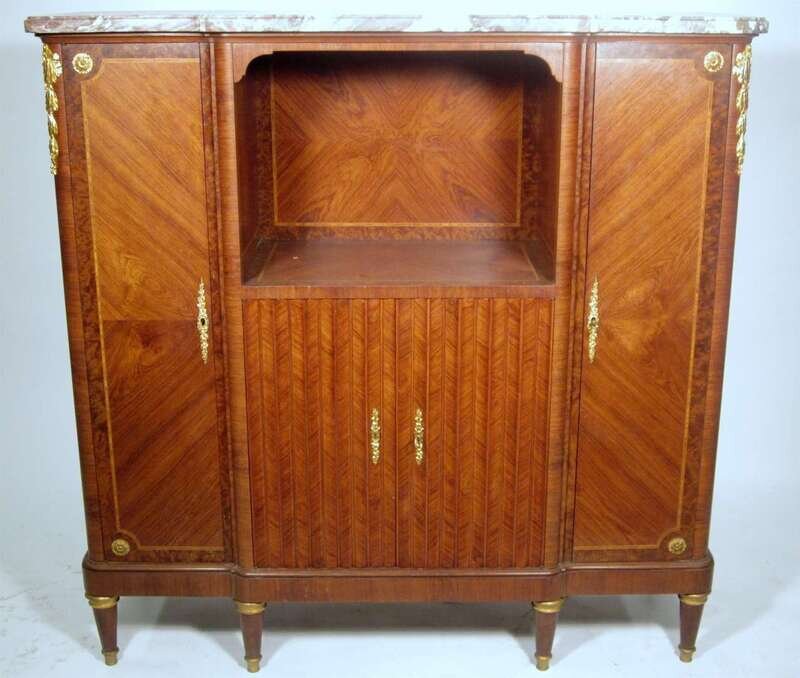 Louis XVI style marble top gilt metal mounted kingwood and burl walnut buffet
