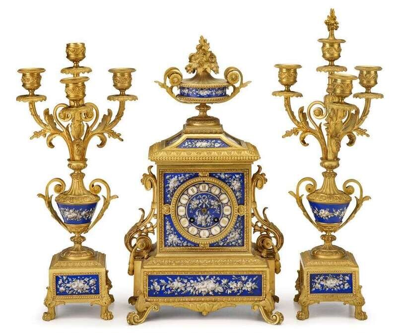The mantle clock with circular dial, gilt Roman numerals, surmounted by an urn, flanked by scroll supports and raised on scroll feet, the whole inset with porcelain panels decorated to show white flowers on a blue ground; together with twin urn-form candelabra issuing four acanthus scrolled candlearms.