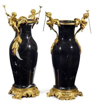 Baluster form, mounted to the shoulder with putti-form handles, raised on rococo scroll base.