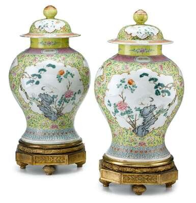 Fine pair of French gilt bronze mounted Chinese famille rose porcelain covered jars 19th century