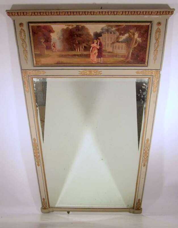 The egg and dart carved top over a painted scene on canvas depicting courting couples within an architectural landscape above a large rectangular beveled mirror plate.