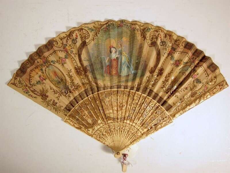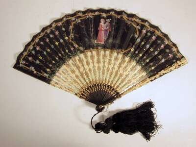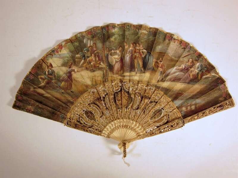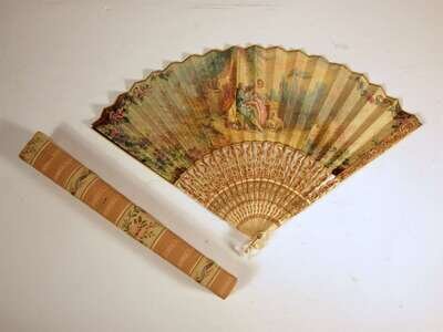 Each painted to show figures in eighteenth century dress, with carved and colored sticks and guards, one boxed. (4).