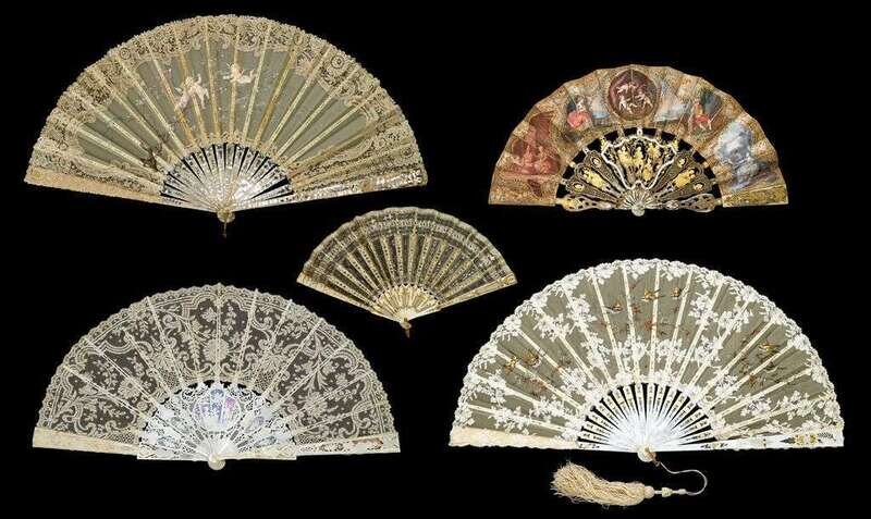Comprising a lace fan with abalone sticks and guards, the lace painted to show putti flying amongst a blossoming tree, in a silk box with Geo. C. Shreve & co. San Francisco retailer's stamp; a lace fan with mother of pearl and abalone guards and sticks finely carved to show musical trophies, urns, and figures; a lace and abalone fan painted to show songbirds; and an abalone and paper fan painted to show figures in landscapes, with white and gilt metal mounted sticks and guards; together with another. (5).