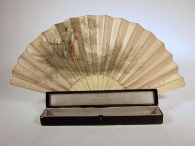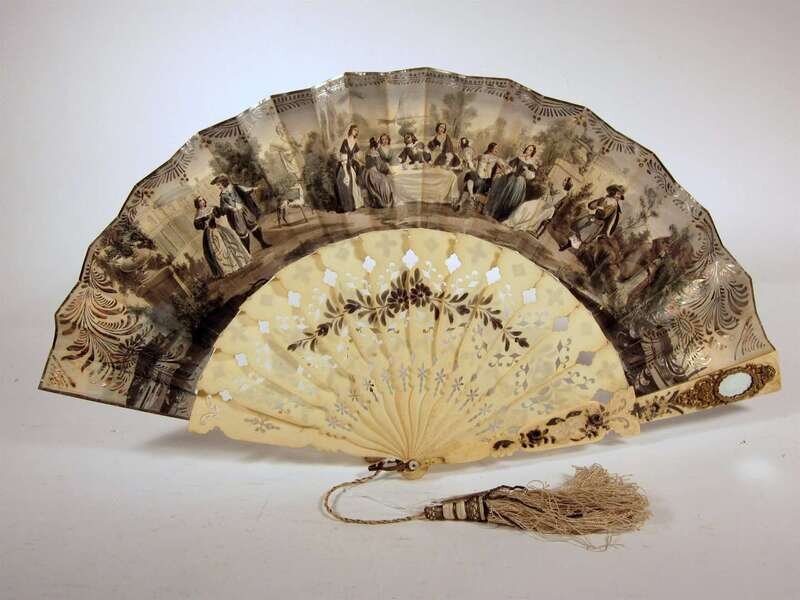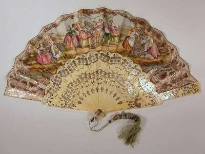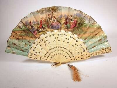 Comprising a bone fan finely carved to imitate lace; an ivory fan, the guard carved to show flowerheads and cupid; a paper and carved bone fan, painted to show a garden scene with figures; a bone and paper fan, painted on both sides to show figures dancing and musicians; another similar; and a bone and silk fan painted to show a couple in a landscape, boxed. (6).