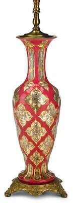 Converted to a lamp, baluster form with gilt painted clear cut bands to pink glass body, raised on gilt metal foliate cast base.
