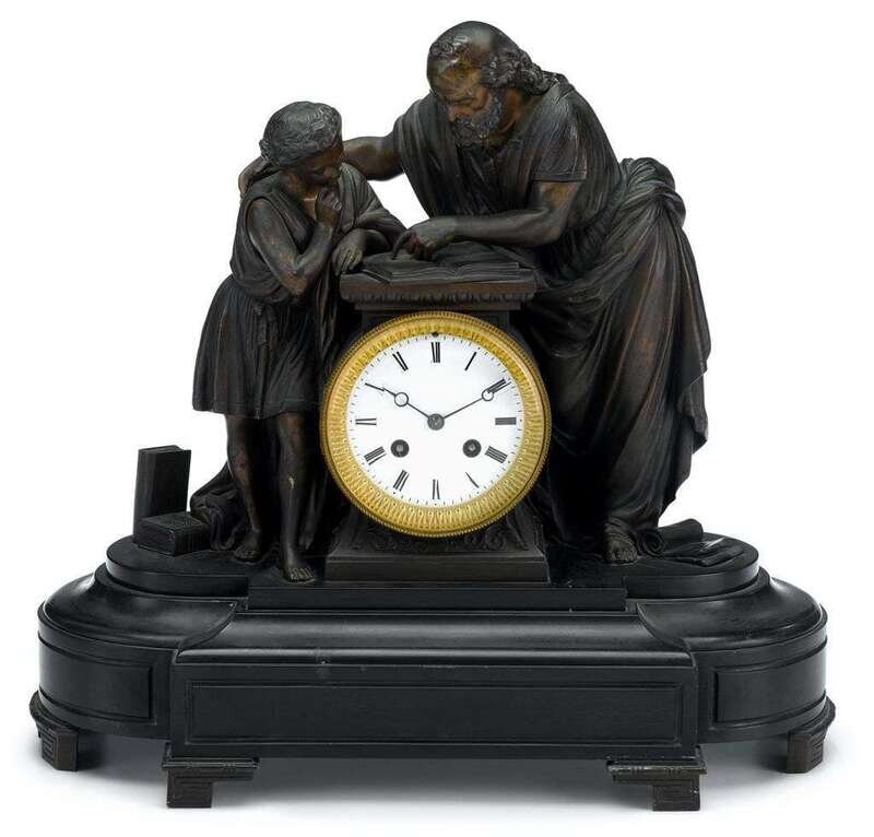 The circular white enameled dial with Roman numerals, surmounted by scholar and attendant, raised on shaped black marble base.