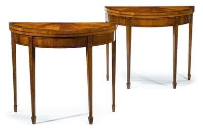 The demi-lune crossbanded top inlaid with burl walnut and satinwood fan, opening to a green felt lined surface, over an ebony strung frieze, raised on tall square tapering legs terminating in spade feet. (2).