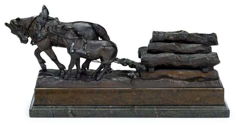 Dark brown patina, cast to show a harnessed horse and foal dragging a sleigh of logs, on naturalistic base signed 'Martin' and inscribed 'Germany'.