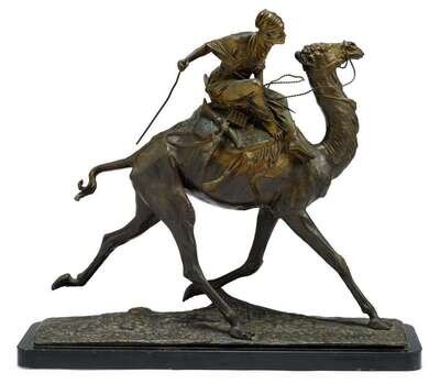 Bronze, mid-brown patina, depicting the masked warrior sat upon the running camel, raised on a naturalistic base inscribed 'E. Drouot', on black marble plinth.