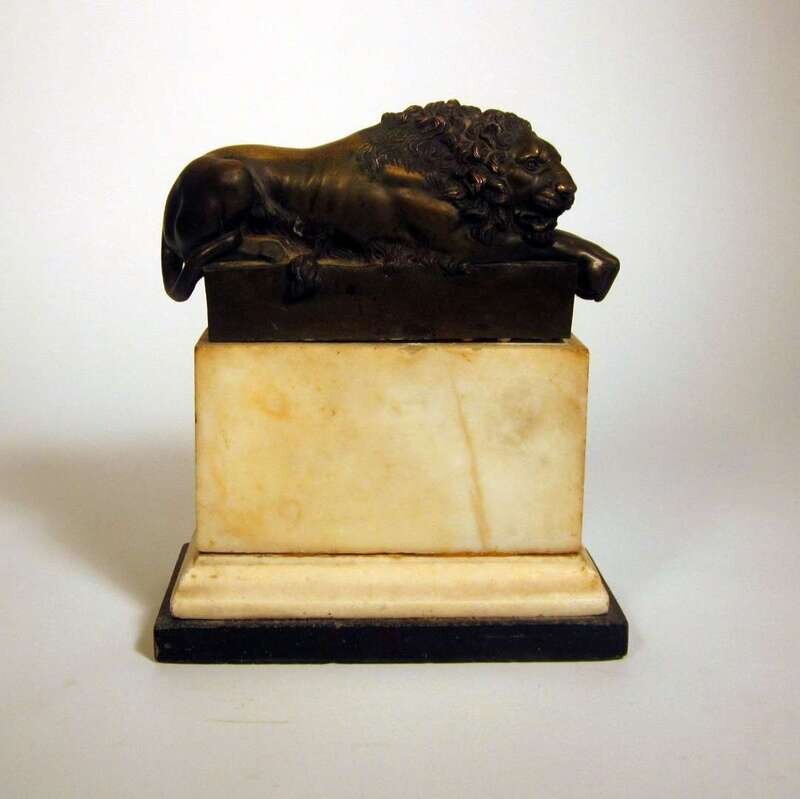 Bronze, brown patina, the recumbent lion on square base, raised on tall marble plinth.