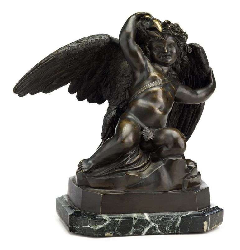 Modeled showing the young boy grasping the eagle behind its head and wing, raised on canted square base inscribed "Nelli Roma", on conforming verde antico marble plinth.