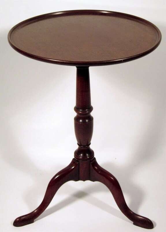 The circular dished tilt top over turned column terminating in three shaped legs.