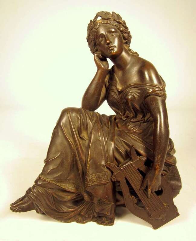 Bronze, medium brown patina, modeled as a seated classical lady holding a lyre.