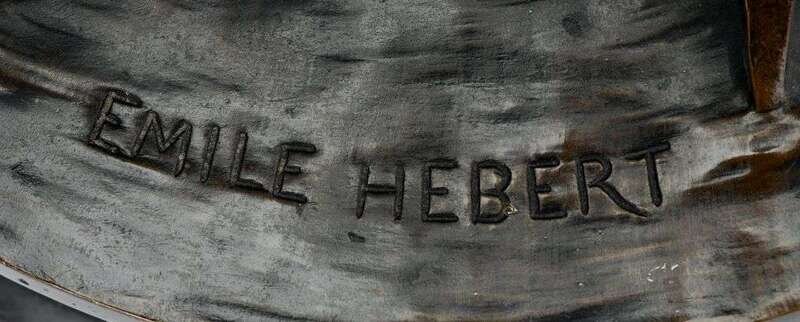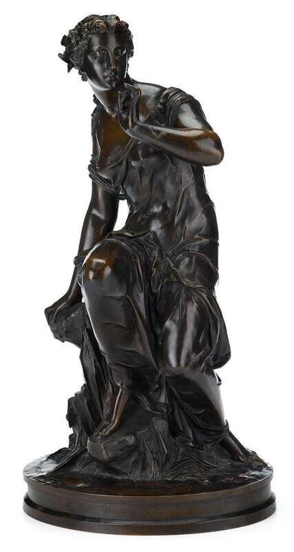 Bronze, dark brown patina, depicting the beauty in diaphonous robes sat upon a rocky outcrop with a stream running over her feet.