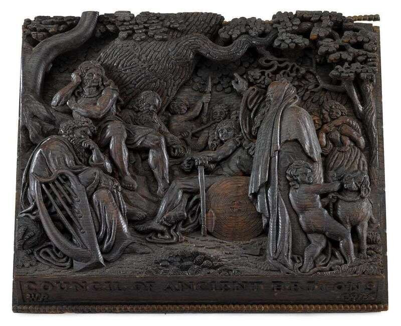 Carved to show on the right a druid with a long beard and a cloak over his head, pointing up to the sky and holding a scroll in the other hand, with a group of other men, including a bard sitting with his lyre at the foot of a large oak tree, young children and dogs. Titled at lower edge, and with initials "WR" and "GRPJ".
