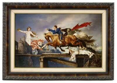 Rectangular form, finely painted to show a mounted rider emblematic of Avarice, galloping across a bridge over a chasm to chase gold coins being thrown by a semi-nude maiden emblematic of Fortune, as Death on a black horse follows closely behind, a view of a castle in the background at the left, signed 'Wagner' lower right, impressed KPM and sceptre marks verso, within molded wooden frame.