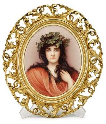Depicting the dark-haired beauty wearing an ivy wreath and a pale red shawl, impressed KPM and sceptre marks verso, within a carved giltwood frame.