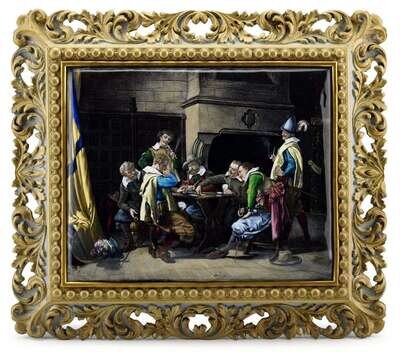The rectangular copper plaque enameled to show a group of 18th century gentlemen imbibing and playing cards, signed 'T Soyer' lower left, within an acanthus scroll carved giltwood frame.