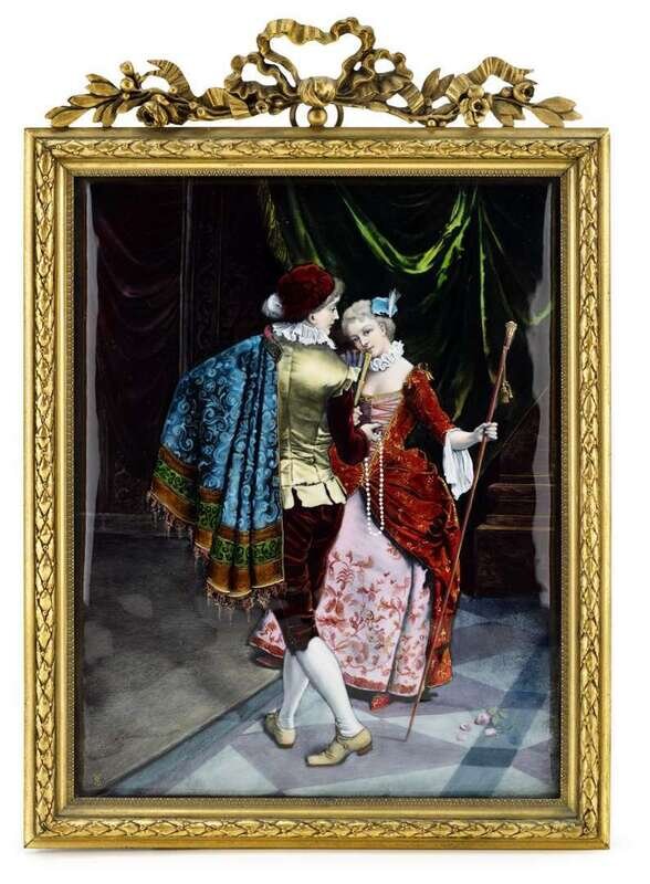 The rectangular copper plaque, enameled to show an early 18th century couple dancing, signed in monogram 'TS' lower left, within a laurel cast gilt bronze frame.