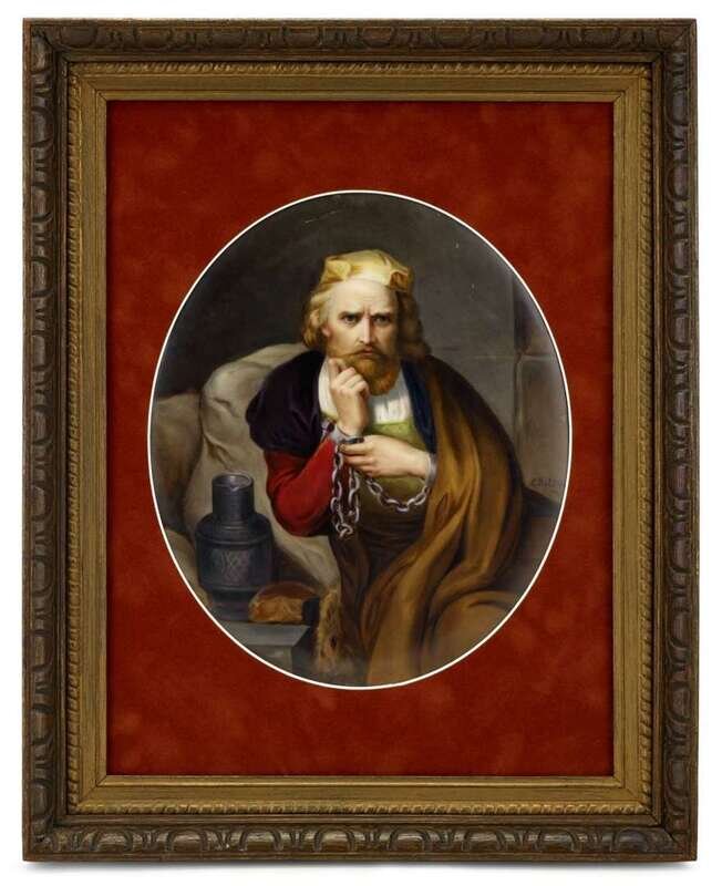 KPM painted porcelain plaque of Columbus in chains late 19th century, signed c. dalton, possibly outside painted