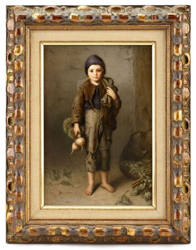 Depicting the shoeless peasant boy in tattered clothes with turnips in hand, a spilled basket behind him, impressed KPM and sceptre marks verso, within a carved wood frame.