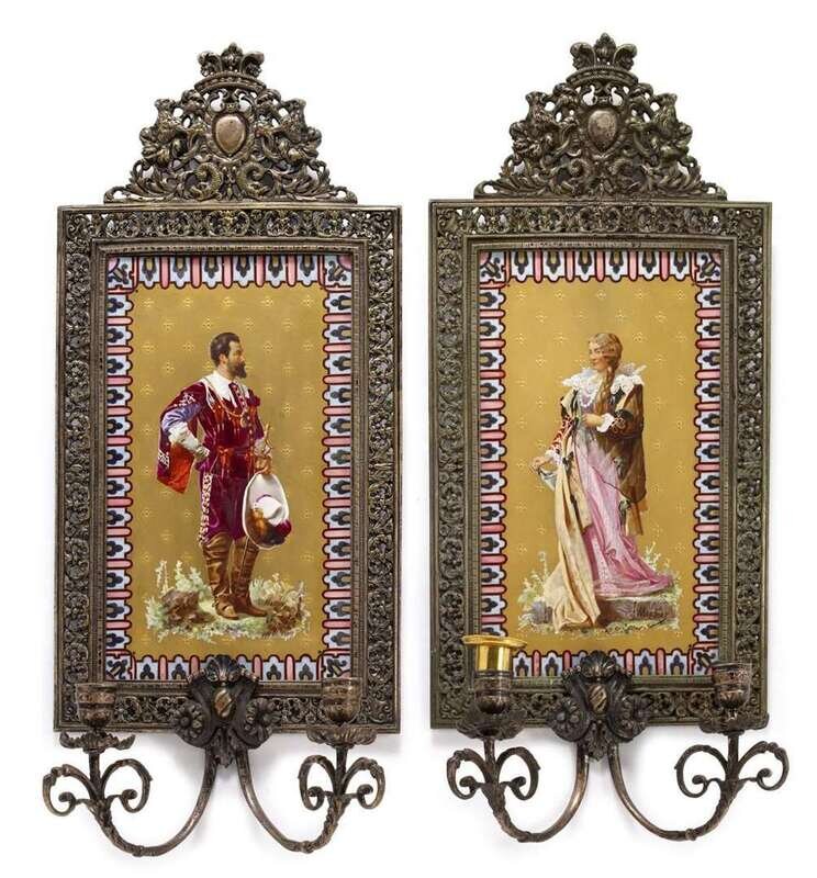 Each rectangular porcelain plaque painted to show a Spanish man or a woman in eighteenth-century dress on a gilt background, within an Etruscan style pink and blue border, signed "Martin", within a floral scroll frame surmounted by an armorial and issuing two scrolling candlearms.