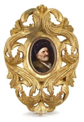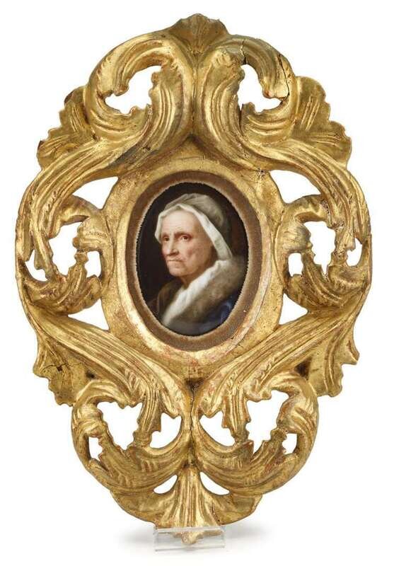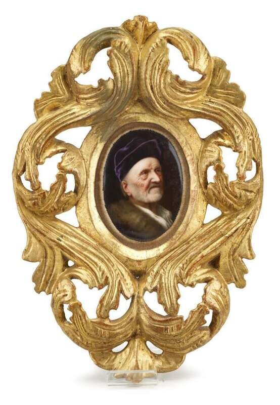 Pair of Continental painted porcelain portrait miniatures 19th century, herr and frau balthasar denner
