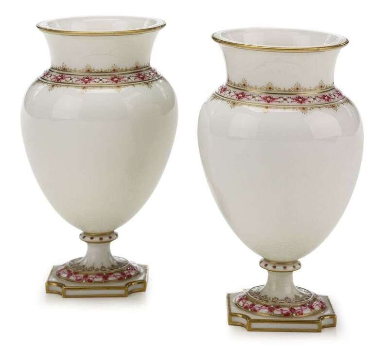 Oviform with flared neck, raised on socle foot on square base, enameled in pink and white to show floral and geometric bands with gilt highlights, red-printed decorating mark for 1889, lozenge mark for 1889, gilder's mark LG and enameler's M mark to base.