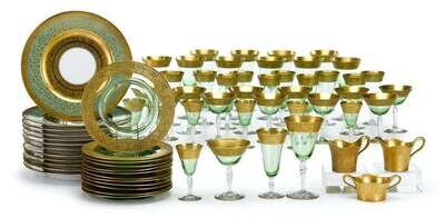 Comprising twelve dinner plates, decorated in gilt on a green ground, twelve glass side plates, six liquor glasses, twelve cocktail glasses, eleven champagne flutes, and eleven wine glasses, all decorated in gilt on green glass; together with three German gilt porcelain sauce boats. (quantity).