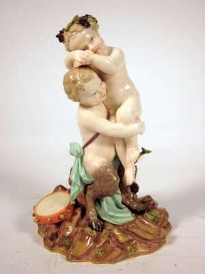 Modeled as a satyr holding the infant bacchus, on a naturalistic base. Blue crossed swords mark and incised D28 to the underside.