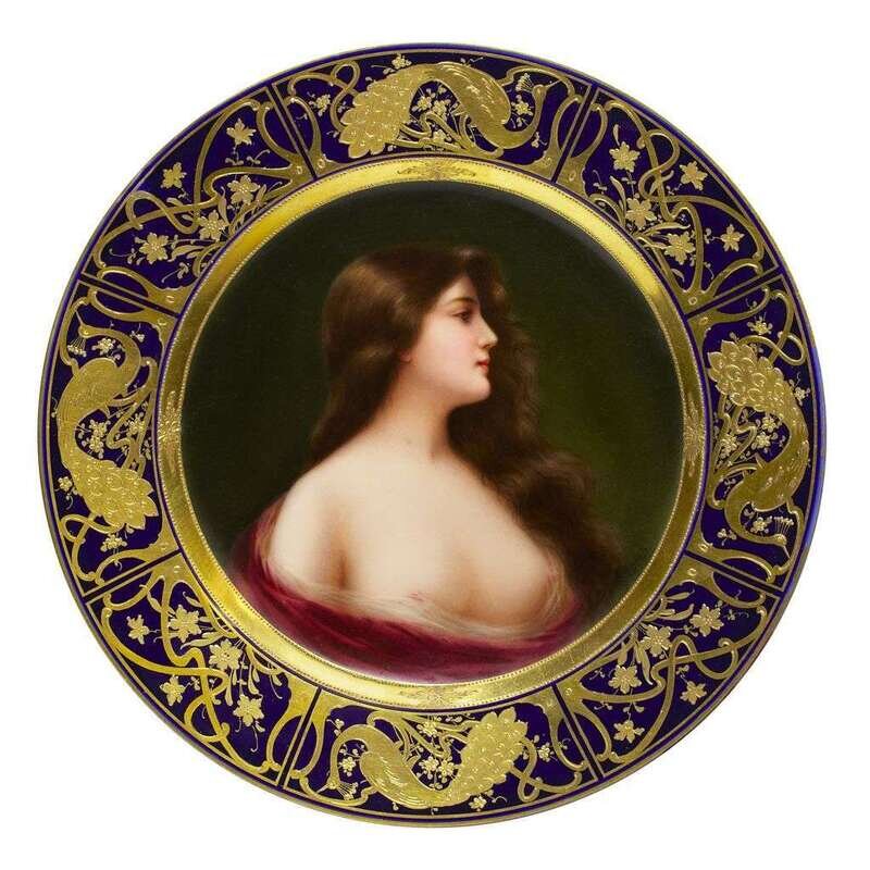 Painted with a semi-nude profile portrait of young beauty, signed 'Storch' within a cobalt panel border with Art Nouveau raised gilt details depicting peacocks and floral sprays, the reverse with underglaze blue crossed forks mark and inscribed 'Odaliske'.