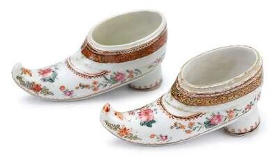 Modeled as Turkish slippers, painted to show floral sprays, lacking lids, in James Robinson retailer's card box. (2).