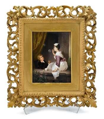 Well painted to show a young maid seated on a ledge blowing bubbles to the delight of a young boy, indistinct impressed marks to reverse, within elaborate scroll carved giltwood frame.