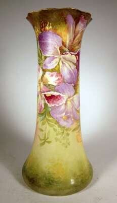 Tapering form, with flared serpentine rim gilt to the interior, the body painted to show floral blossoms on a naturalistic ground, signed 'C. Teugram'. Green Limoges anchor mark painted to underside.