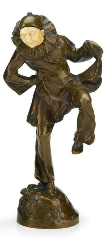 Continental chryselephantine figure of a jester signed p tereszizek, early 20th century