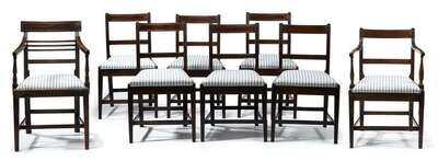 Comprising two armchairs and six side chairs, with reeded splat and supports over drop-in seat, raised on reeded tapering legs.