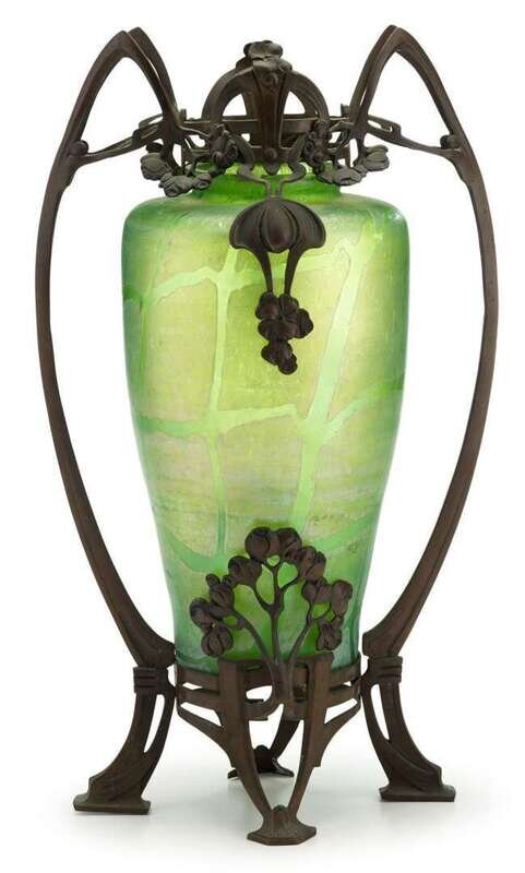 The iridescent painted green glass vase mounted in bronze art nouveau form stand.