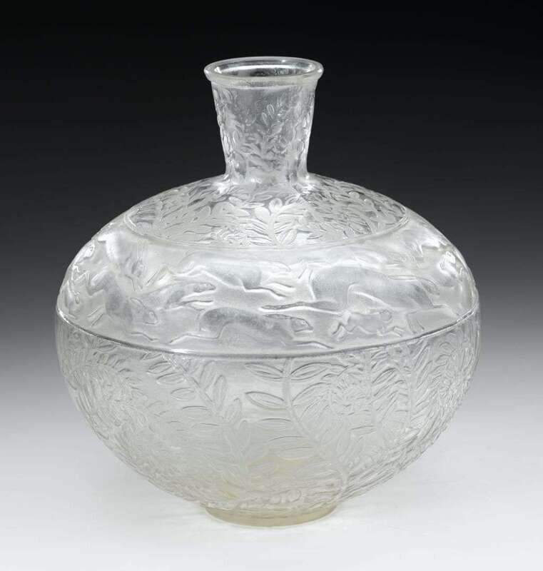 Of globular form the sides molded with a band of running hares within flora, molded R. Lalique to base.