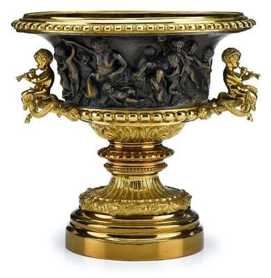 Campana form, the sides cast to show bacchic fauns at play, flanked by twin handles cast to show fauns playing horns, raised on fluted foot above oval plinth.