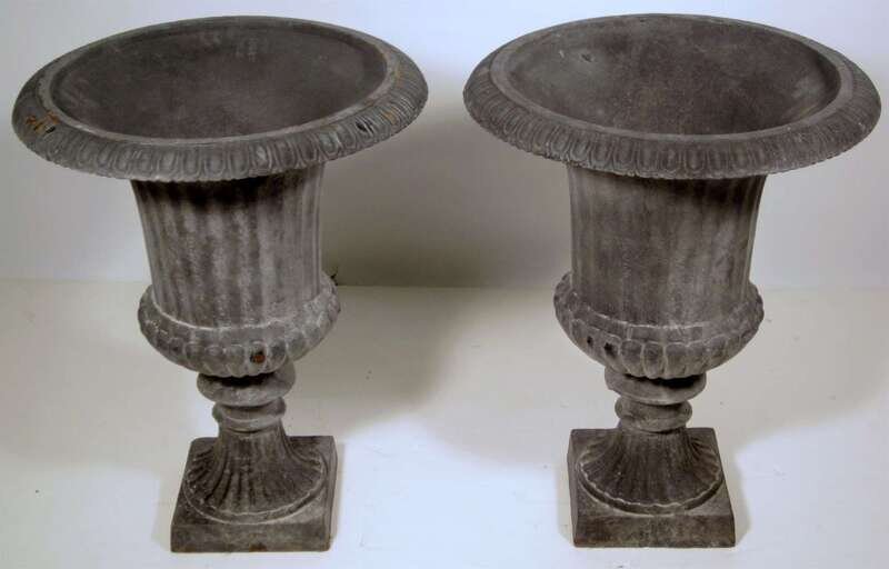 Dark grey patina, campana form, raised on square base. (2).