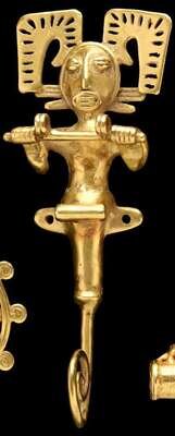 In the form of a stylised human wearing an elaborate headress and holding a bar in his hands.