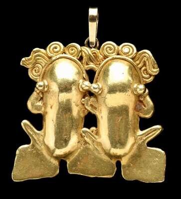 Worked as a pair of frogs with spirals around the mouths, recent gold suspension loop applied.