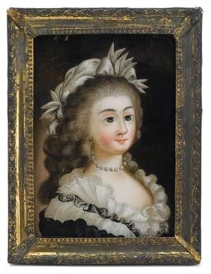 The busts of a hatted female sitter and her bewigged male counterpart depicted in the garb of Continental aristocrats of the late 18th century; in similar wood and metal frames.