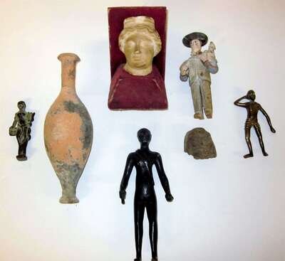 Slender ovoid form with narrow spout; together with an earthenware fragment of a face; a small antique carved marble head, possibly Greek; a bronze figure of a Greek athlete; a small bronze figure of a female with lute; and a small brass figure. (6).
