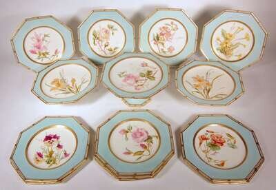 Comprising twelve plates and three cake stands, each of octagonal form, the floral painted center with gilt greek key banding within a light blue border with gilt rim. (15).