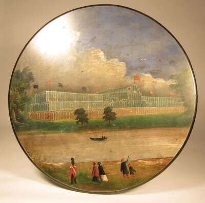The circular slate top painted to show a stylised view of the Crystal Palace for the Great Exhibition, 1851, raised on a baluster stem terminating in three scroll legs.