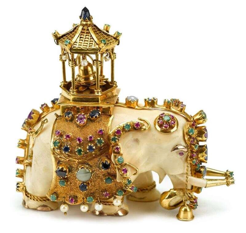 The bull elephant with pagoda-form gold caparison, mounted all over with 14 karat gold, and set with emeralds, sapphires, pearls and pink sapphires.