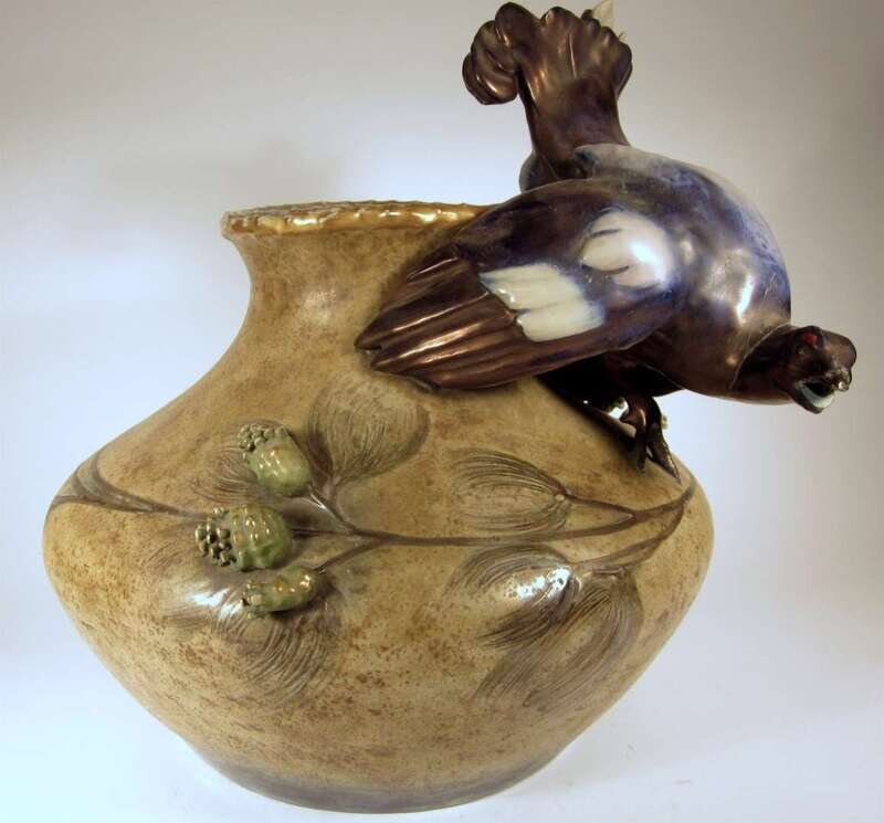 Squat circular form, applied to the shoulder with a large purple bird, the body applied with seed pods, impressed mark 8261 to underside.